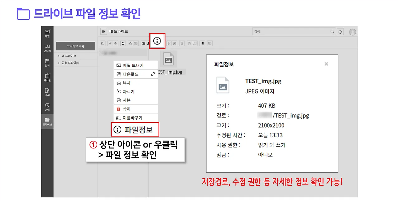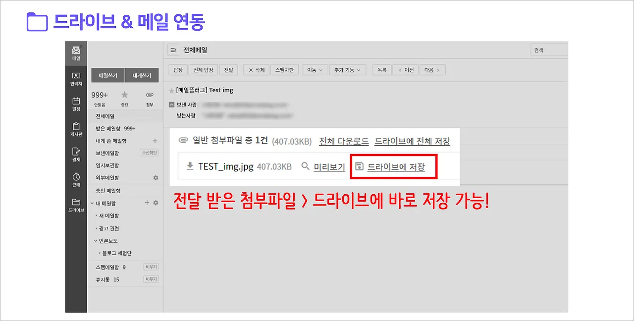 첨부파일 드라이브 저장 버튼 클릭 시, 바로 웹하드에 저장할 수 있습니다.