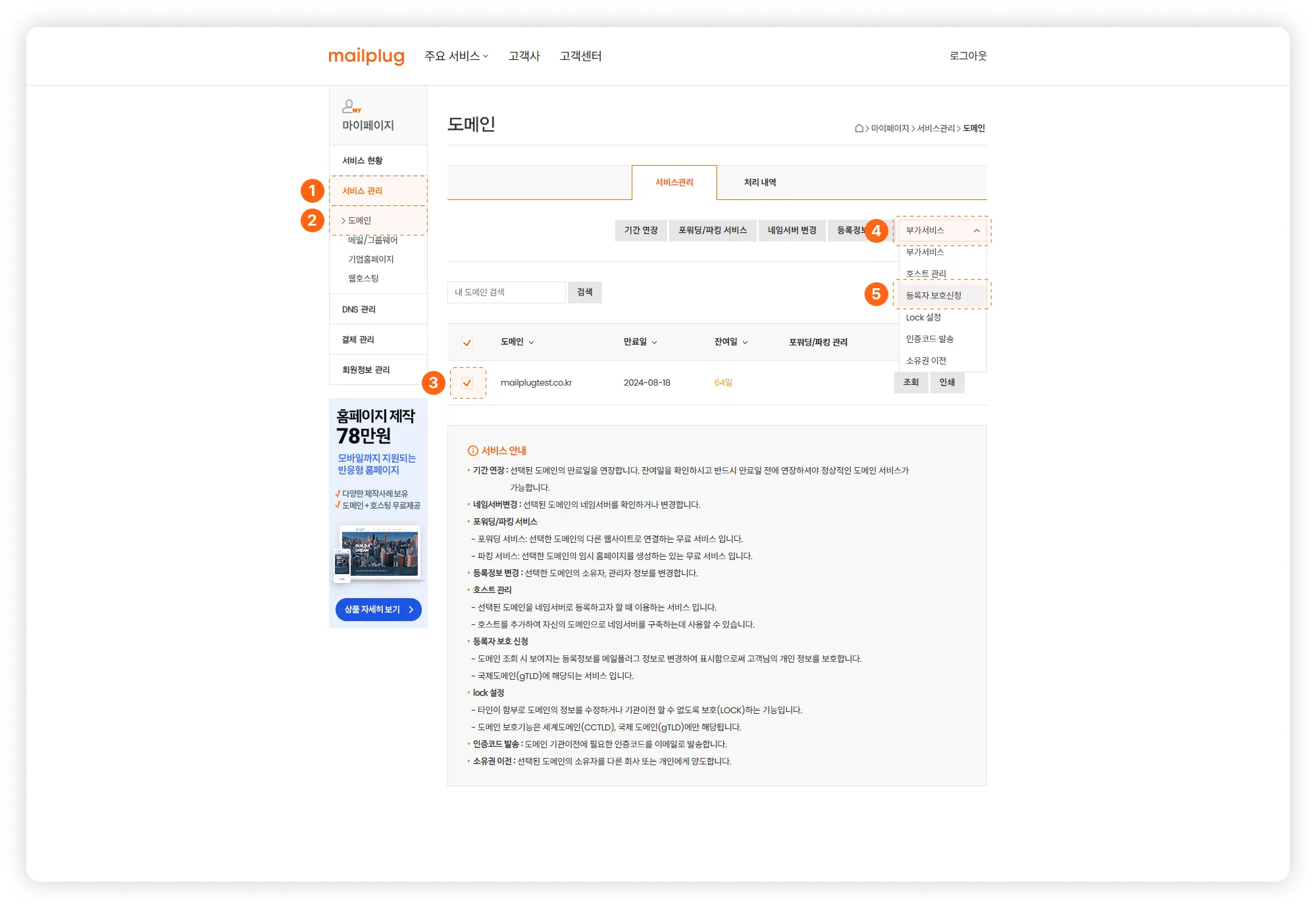 정보 비공개를 신청할 도메인의 좌측 체크박스를 선택한 후, 부가서비스 > 등록자 보호 신청을 클릭해 주세요.