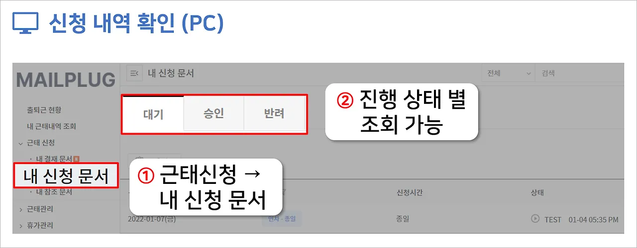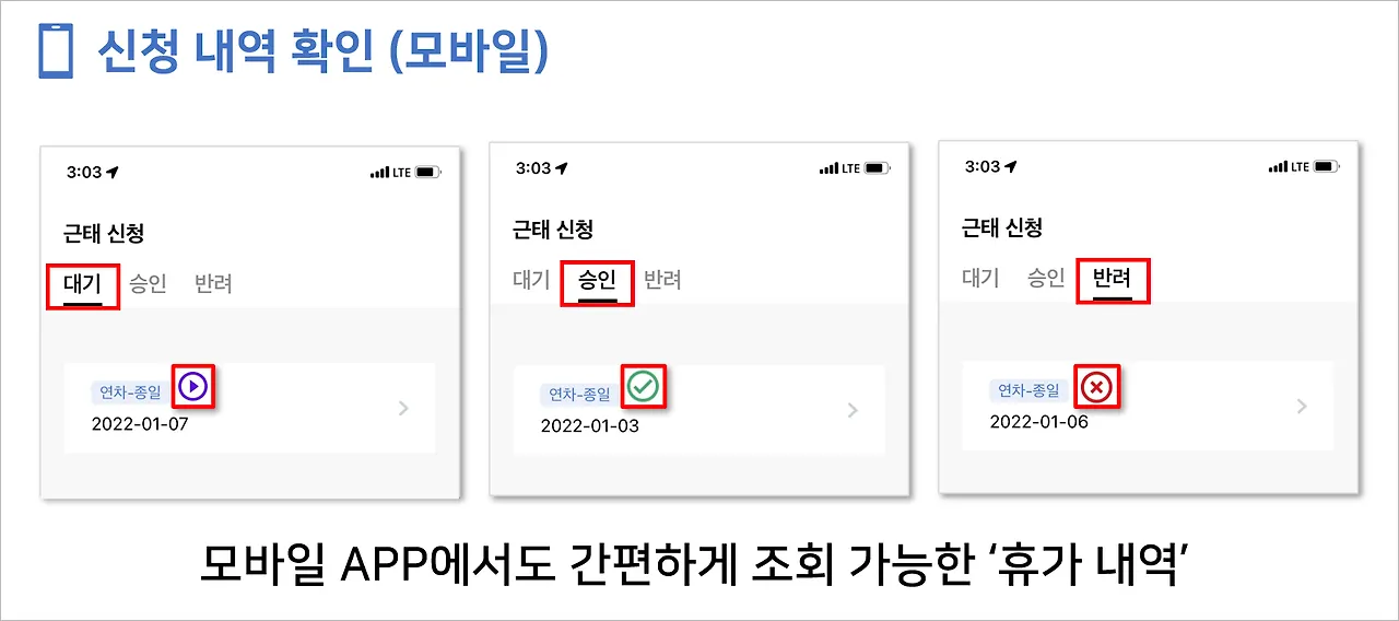 모바일은 근태 신청 탭에서결재 문서를 확인할 수 있는데요.