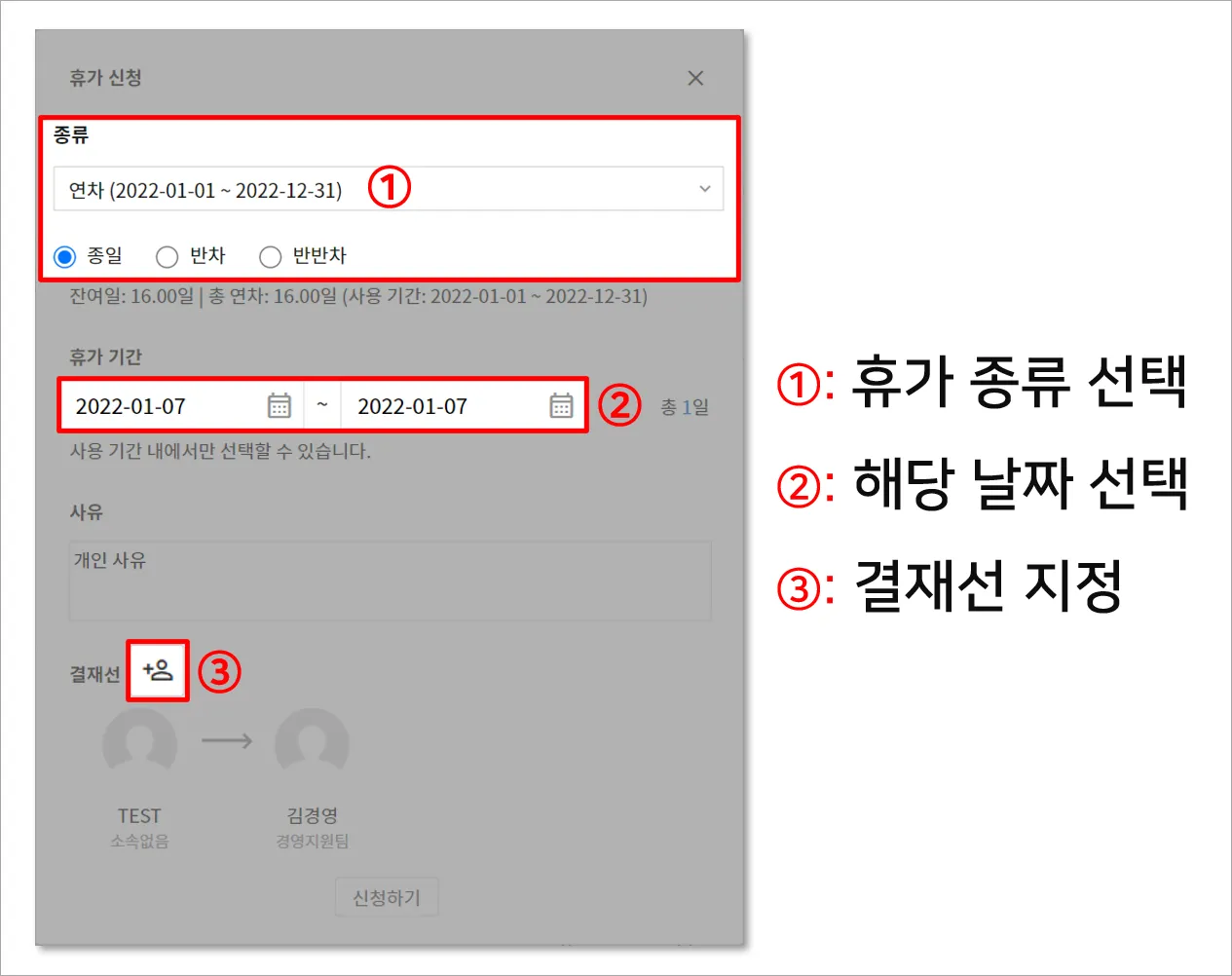 휴가 종류 / 날짜 / 사유 / 결재자만