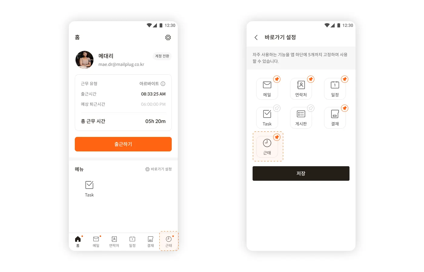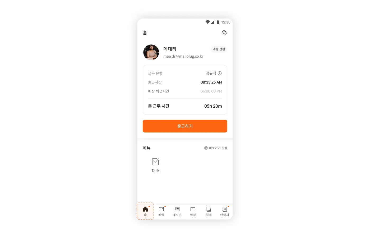 그룹웨어/기업메일 앱에 홈 메뉴가 새롭게 추가되어, 출퇴근 체크, 계정 전환, 바로가기 설정을 보다 빠르고 편리하게 이용할 수 있습니다.