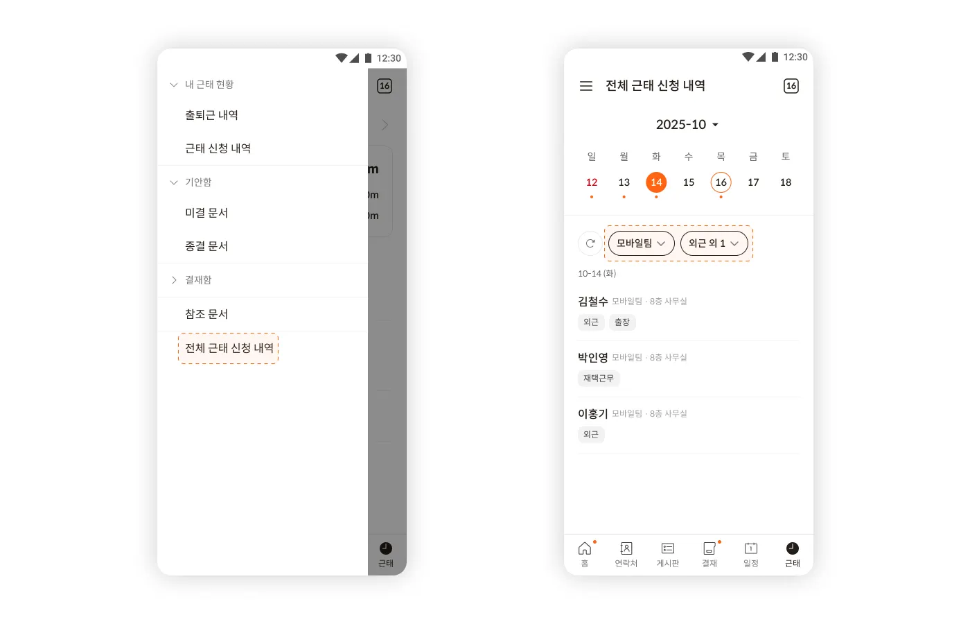 소속, 근무 종류에 따라 사용자의 근태 신청 내역을 확인할 수 있는 기능이 추가되었습니다.
