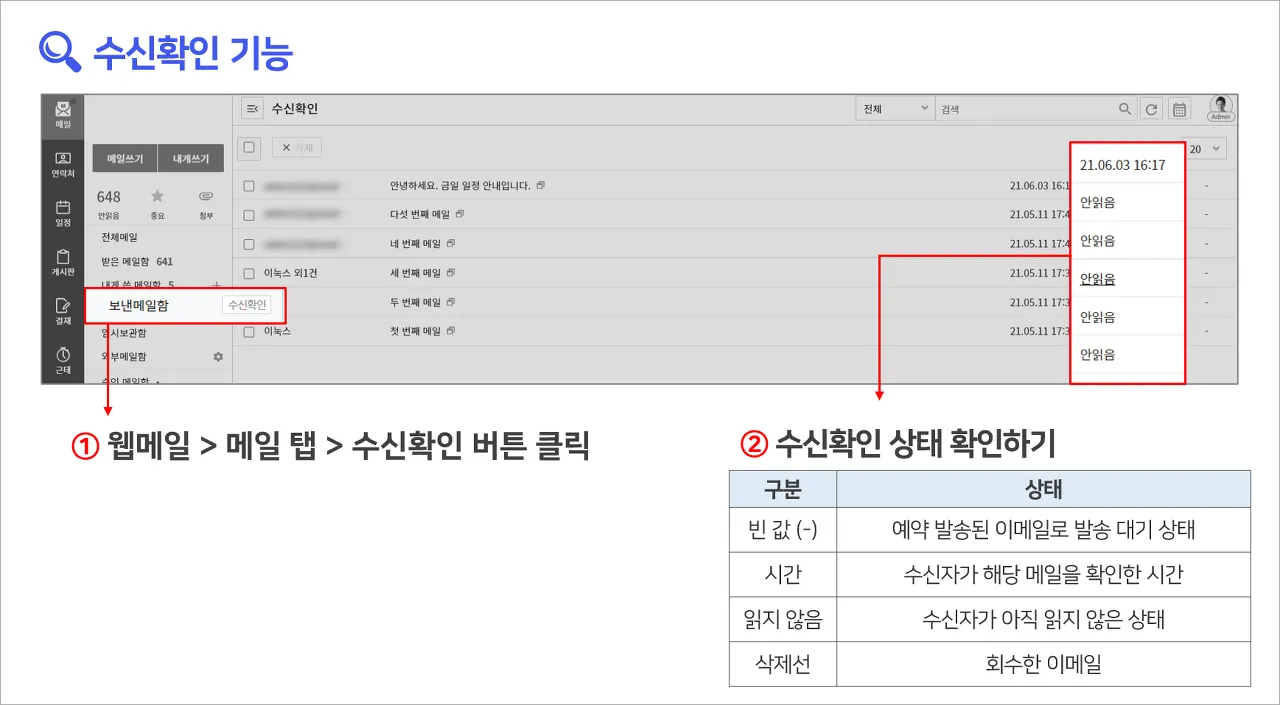 웹메일을 전송한 후, 수신확인 탭을 눌러주세요.