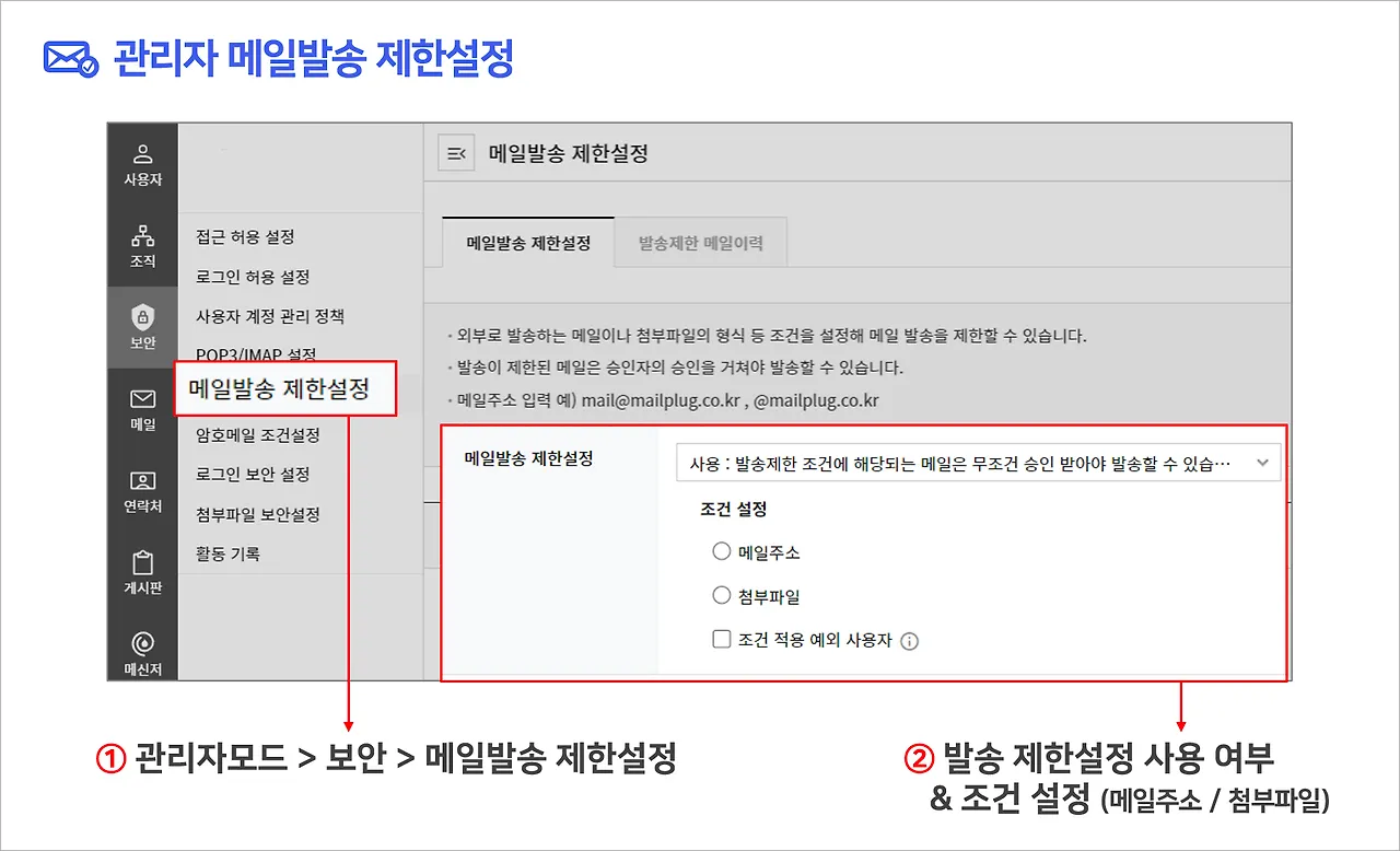 외부로 전달되는 웹메일이나 첨부파일 조건을 설정하여 발송을 제한하는 기능인데요.