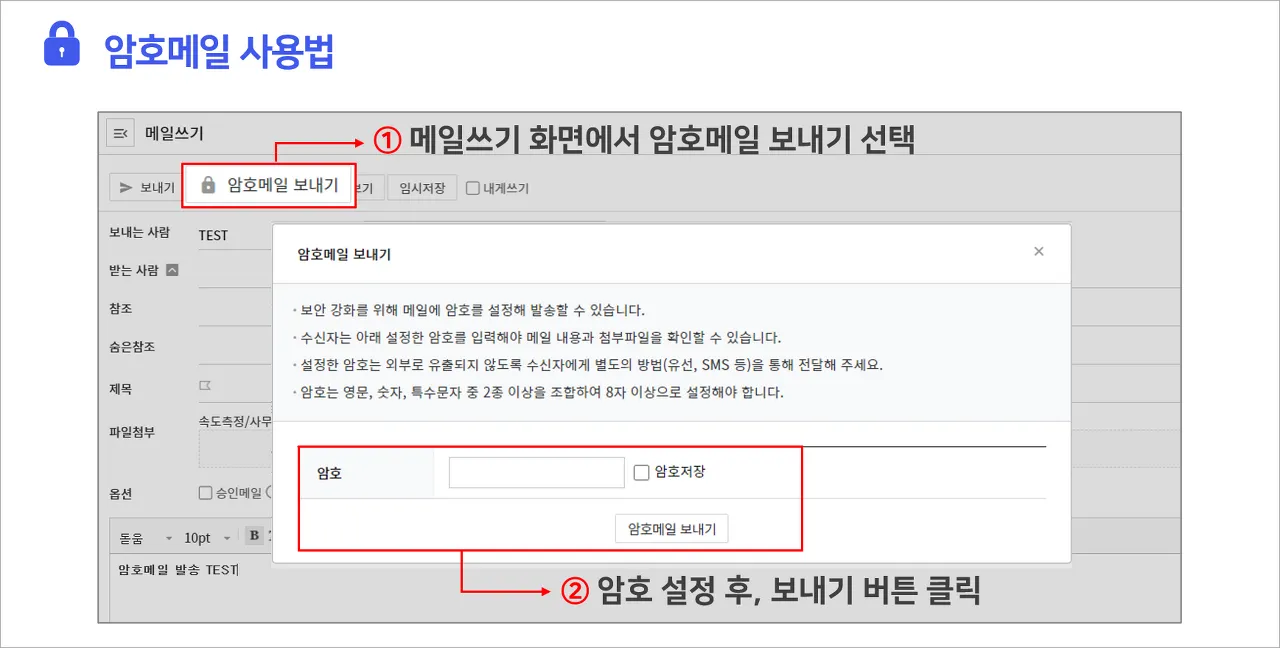 모든 설정을 마친 후, 보내기를 누르시면 암호메일 전송이 완료됩니다.