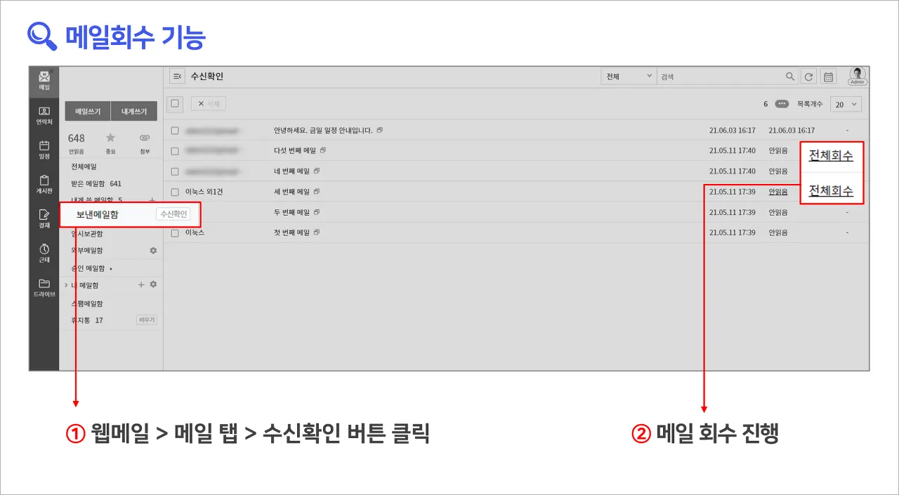 회수기능은 사내로 전송된 이메일 중