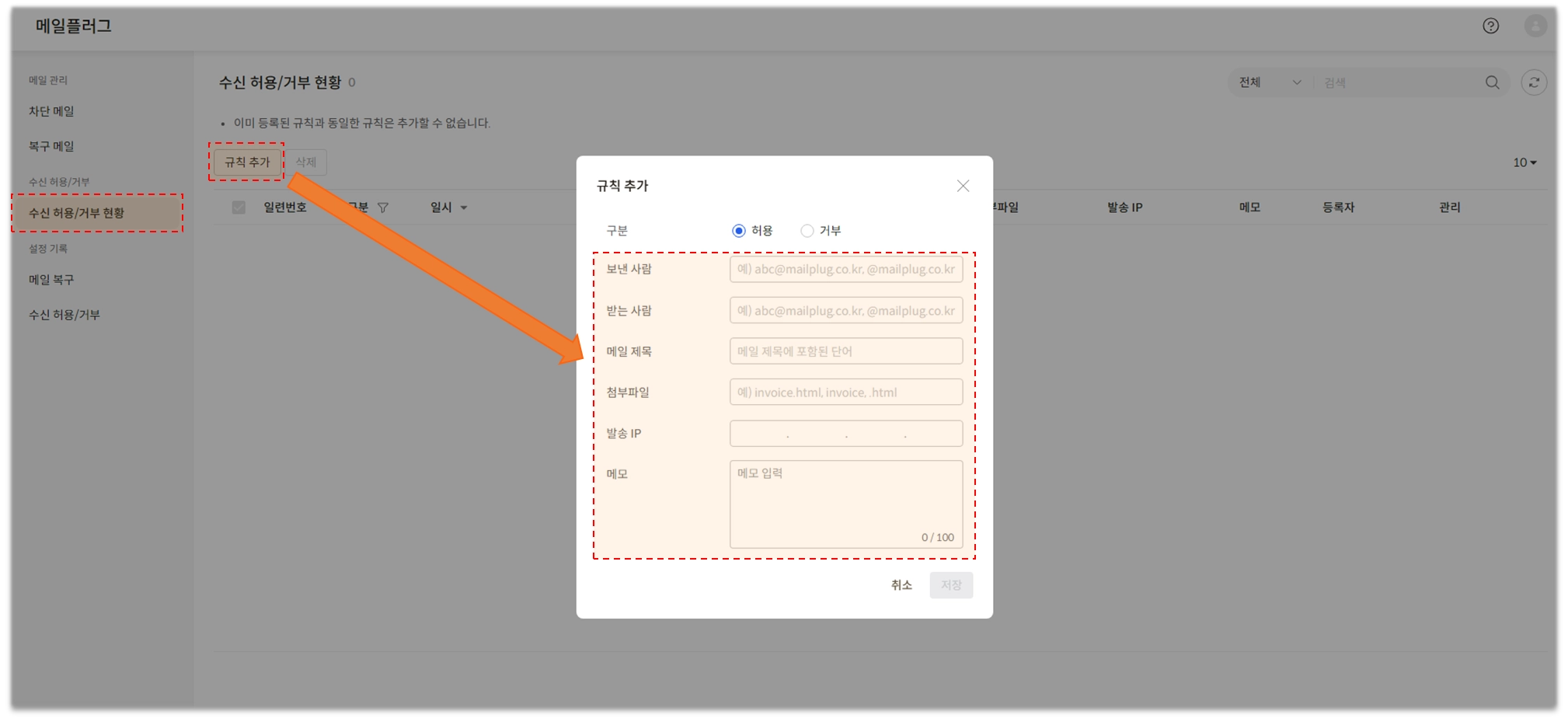 메일필터 관리 → 필터 추가 → 받는 사람 (예시) (특정 계정) mail@mailplug.co.kr , (특정 도메인) @mailplug.co.kr) 입력 → 보낸사람/제목 등 등록하려는 정보 입력 → 저장