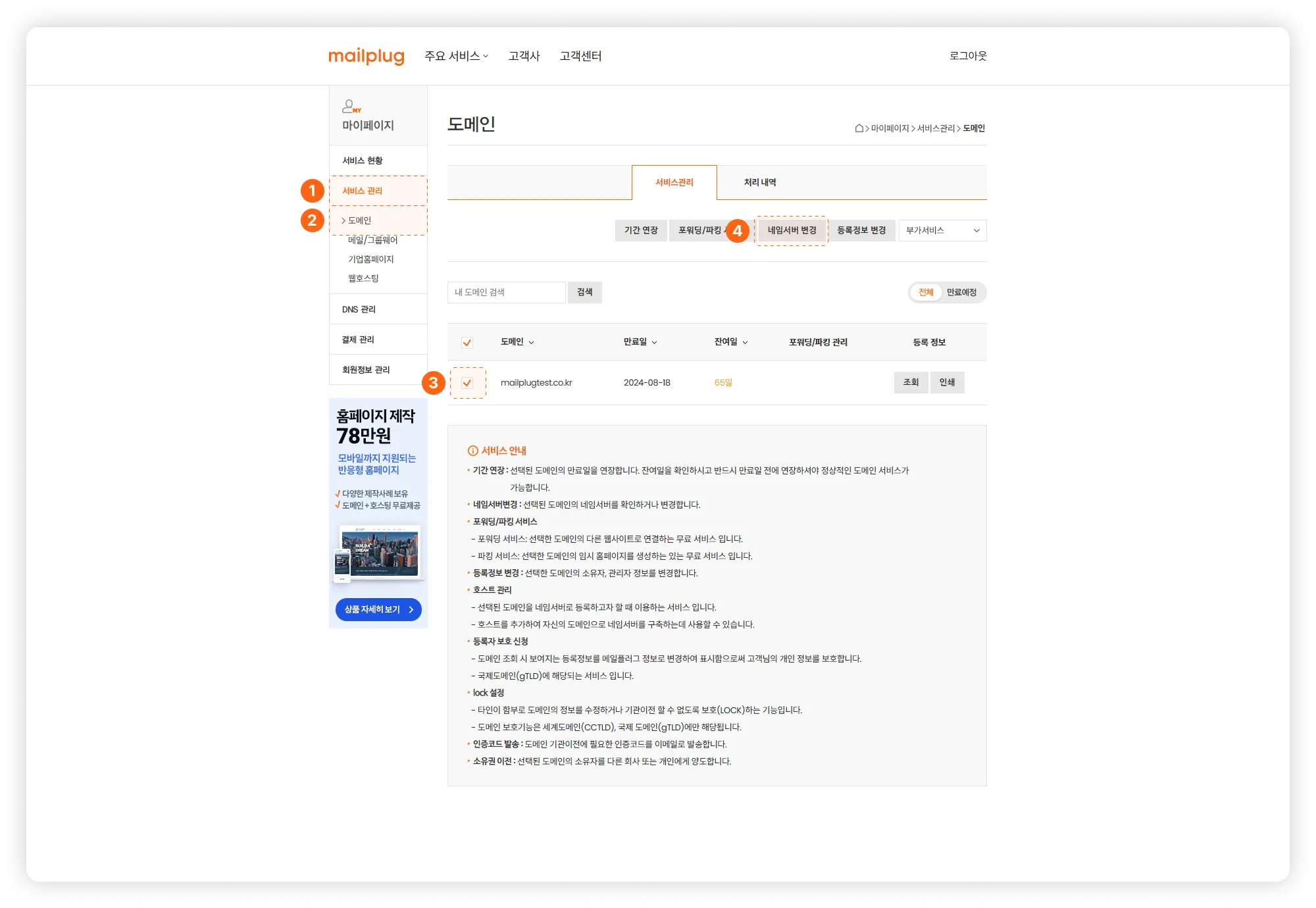 도메인 정보 조회 시 현재 네임서버가 메일플러그로 되어있어야 합니다.