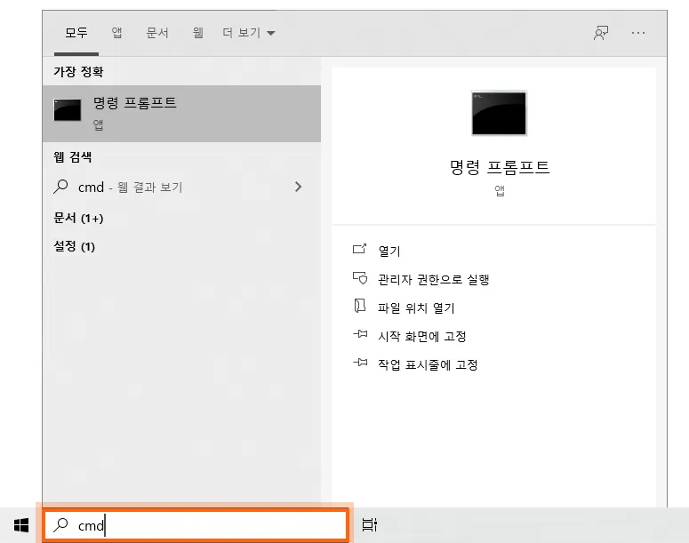[윈도우] 버튼 혹은 [검색] 버튼을 클릭한 후 cmd 를 입력하여 명령 프롬프트 를 실행합니다.