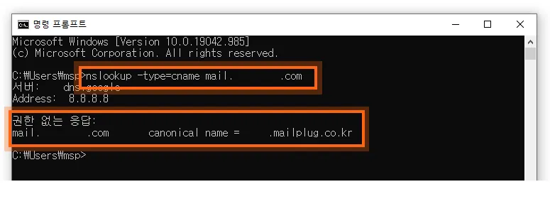 예시) 도메인이 mailplug.com 인 경우, nslookup -type=cname mail.mailplug.com