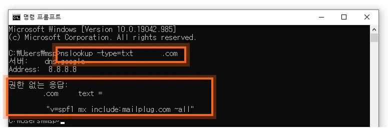 예시) 도메인이 mailplug.com 인 경우, nslookup -type=txt mailplug.com