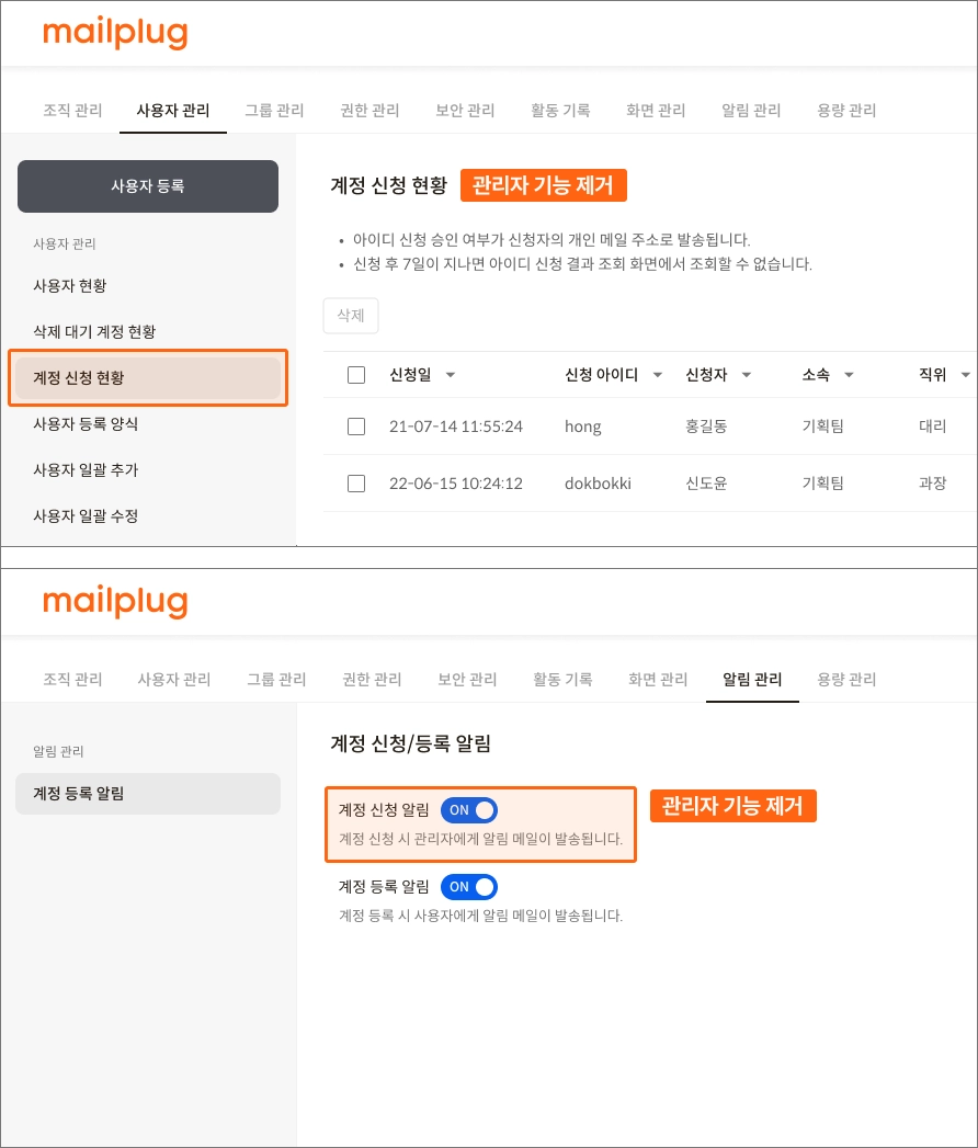 관리자 계정 신청 현황 및 계정 등록 알림 제거