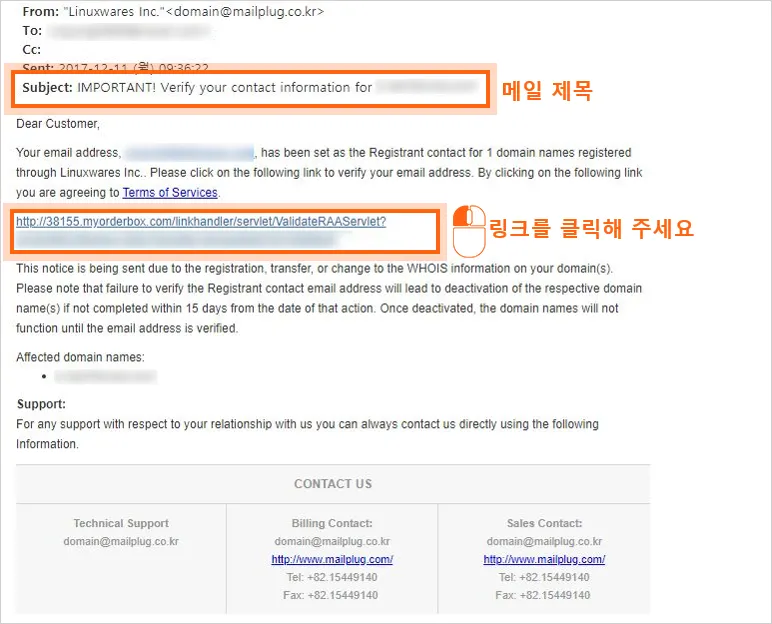 국제 도메인은 국제도메인관리기구(ICANN)의 도메인 등록 절차에 따라 도메인 등록 시 입력한 소유자 이메일로 발송된 인증 메일을 결제 후 15일 이내 승인 처리를 해주셔야 합니다.