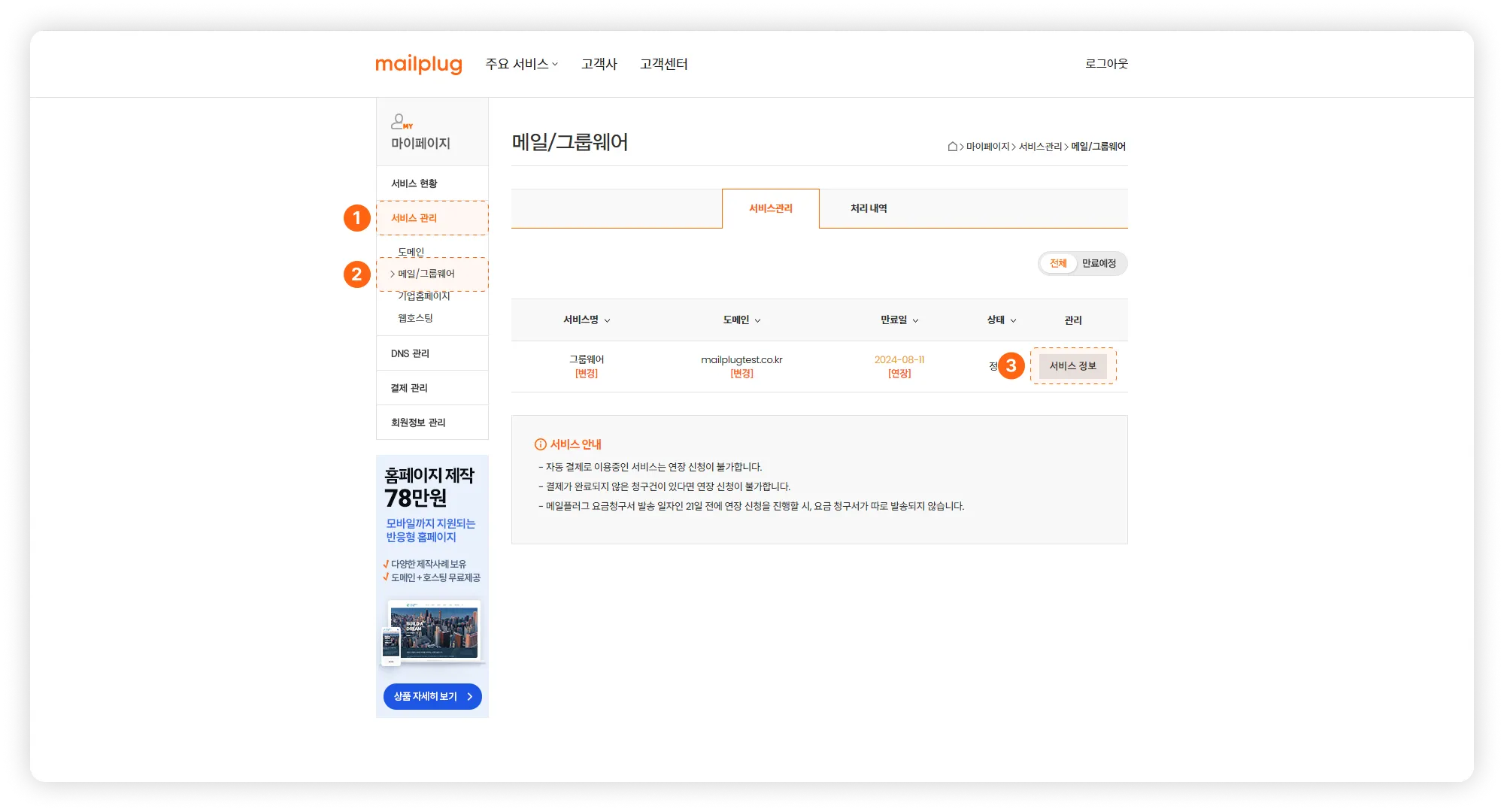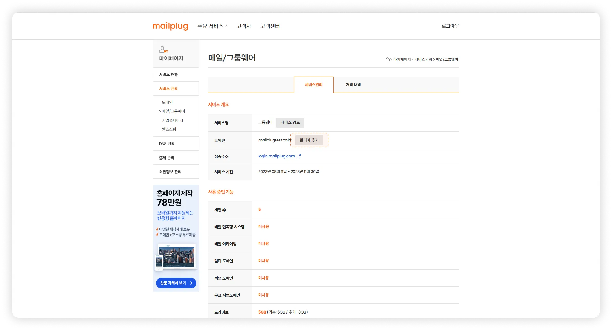 서비스 관리 아래 메일/그룹웨어를 클릭해 주세요.
