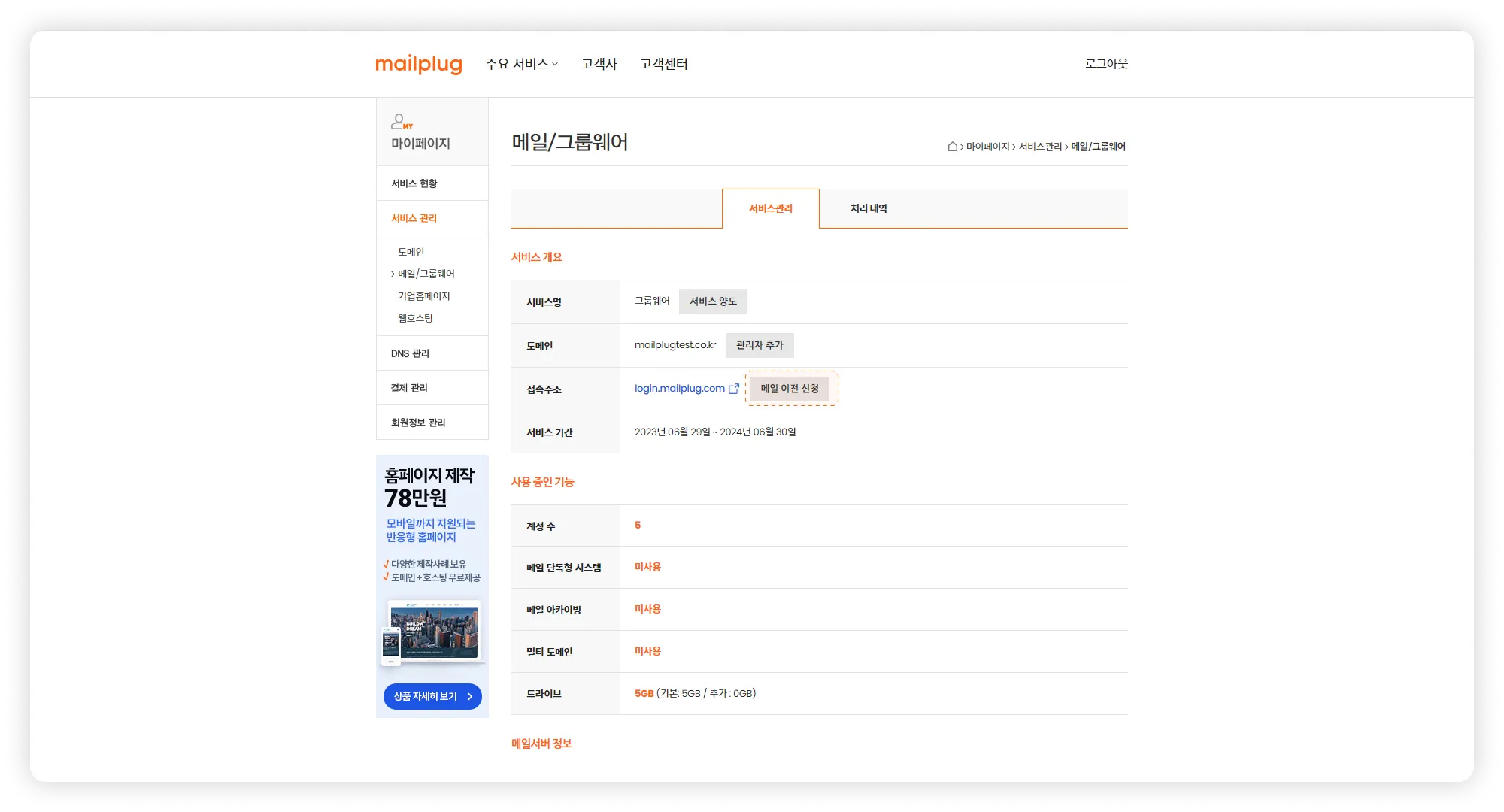 메일 이전 신청 버튼이 확인되지 않는다면 메일플러그 고객센터(TEL. 1544-9140, 기술지원)로 문의해 주세요.