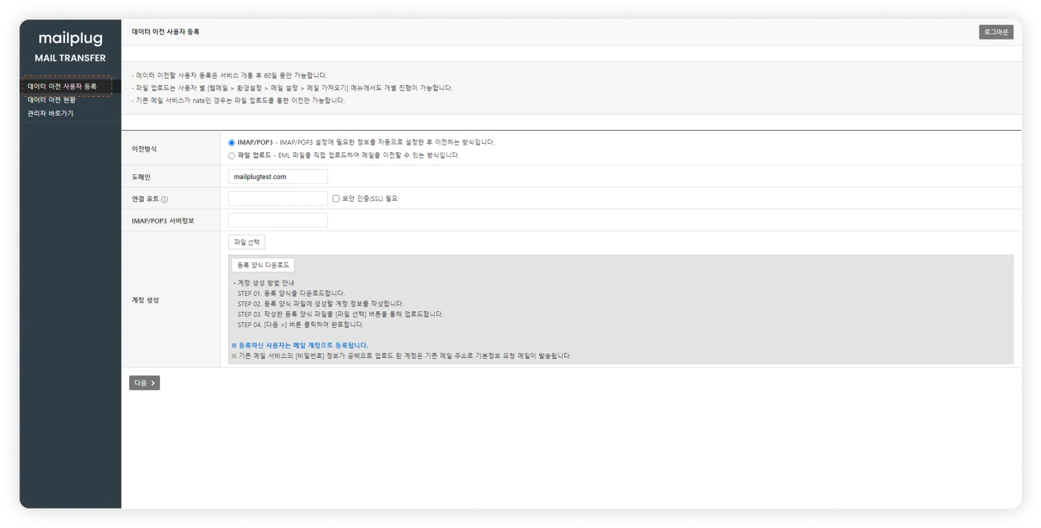 이전 방식 : 기존 업체에서 POP3 혹은 IMAP을 지원한다면 IMAP/POP3를, IMAP/POP3를 지원하지 않아 별도의 .eml 파일로 백업받은 경우 파일 업로드 방식을 선택해 주세요.