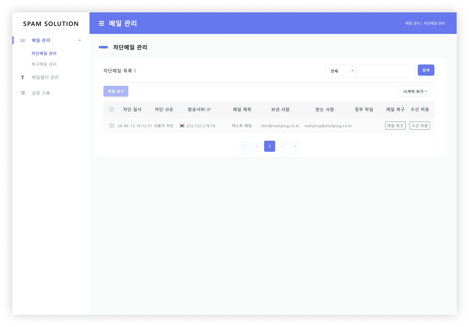 차단/복구 메일 관리, 메일 필터 관리 등 고도화된 기능의 스팸 솔루션이 제공됩니다.