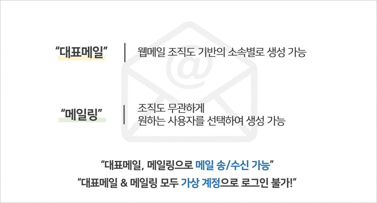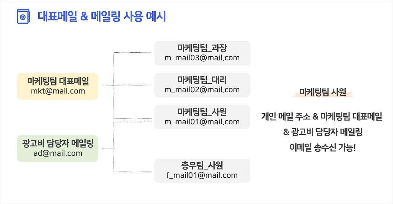 조직도 기반이 아니기 때문에 좀 더 자유롭게 메일주소를 생성할 수 있죠.