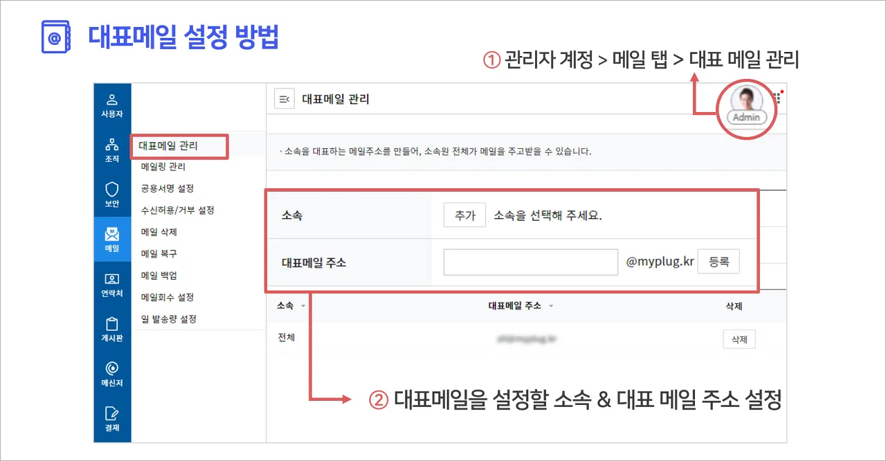 대표메일 관리 탭으로 접속하신 후, 소속을 선택해주시면 됩니다.