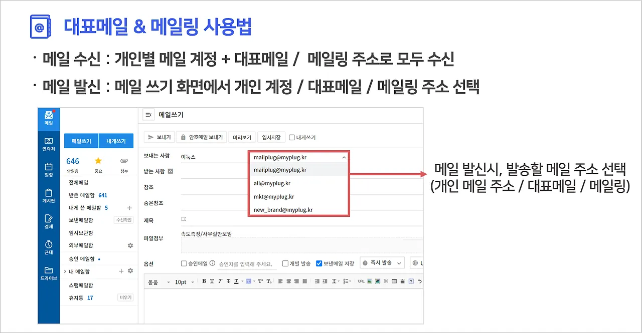 또한, 개인별 계정과 메일링으로 모두 이메일을 송수신할 수 있습니다.
