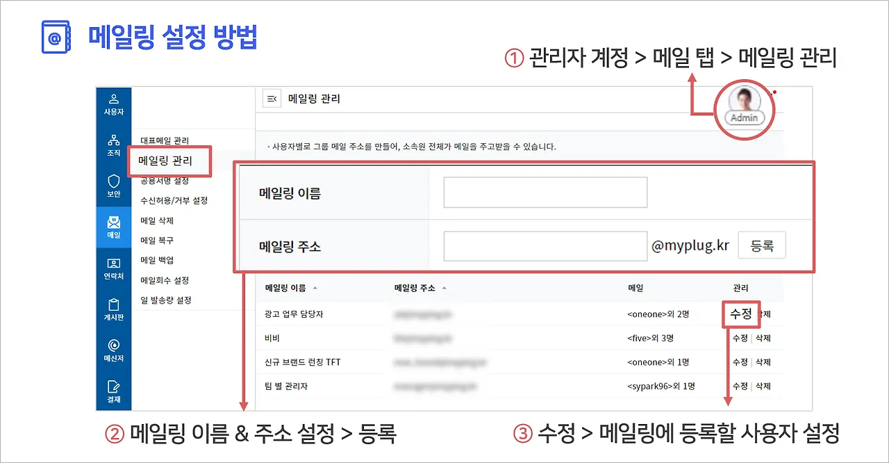 메일링 이름을 먼저 설정하신 후, 주소를 입력하여 등록하시면 되는데요.