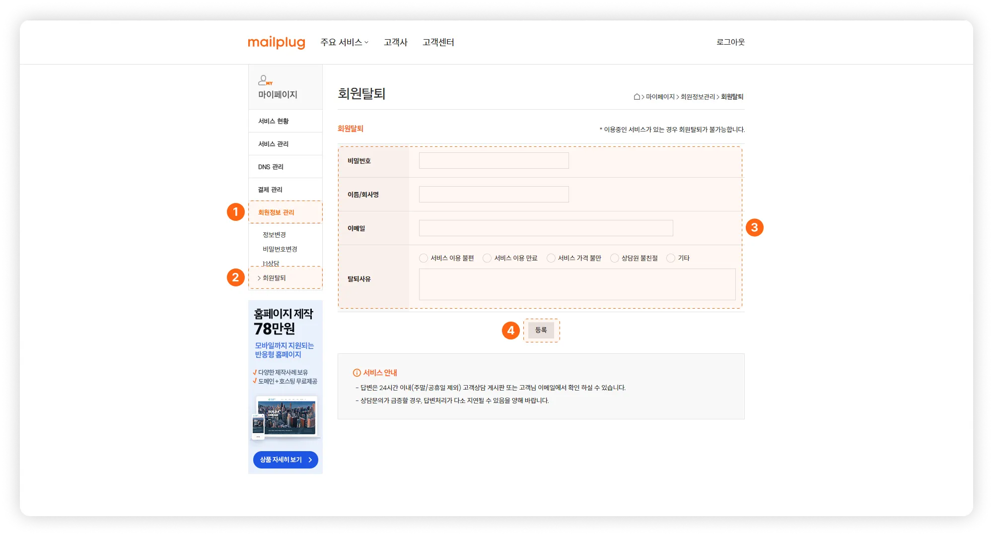회원탈퇴에 필요한 정보를 입력한 후 등록을 클릭해 주세요.