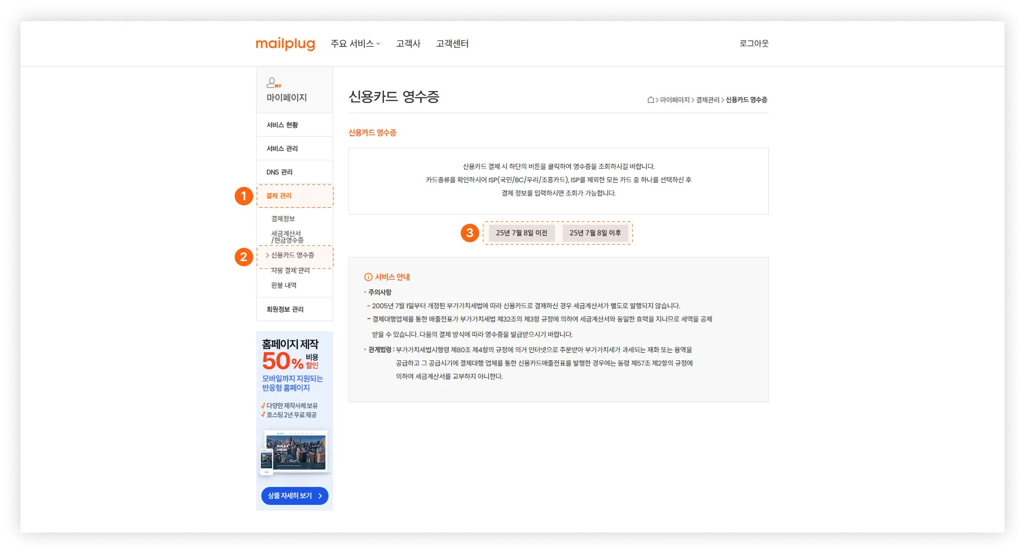 결제 시점에 따라 “25년 7월 8일 이전” / “25년 7월 8일 이후” 버튼을 클릭하여 주세요.
