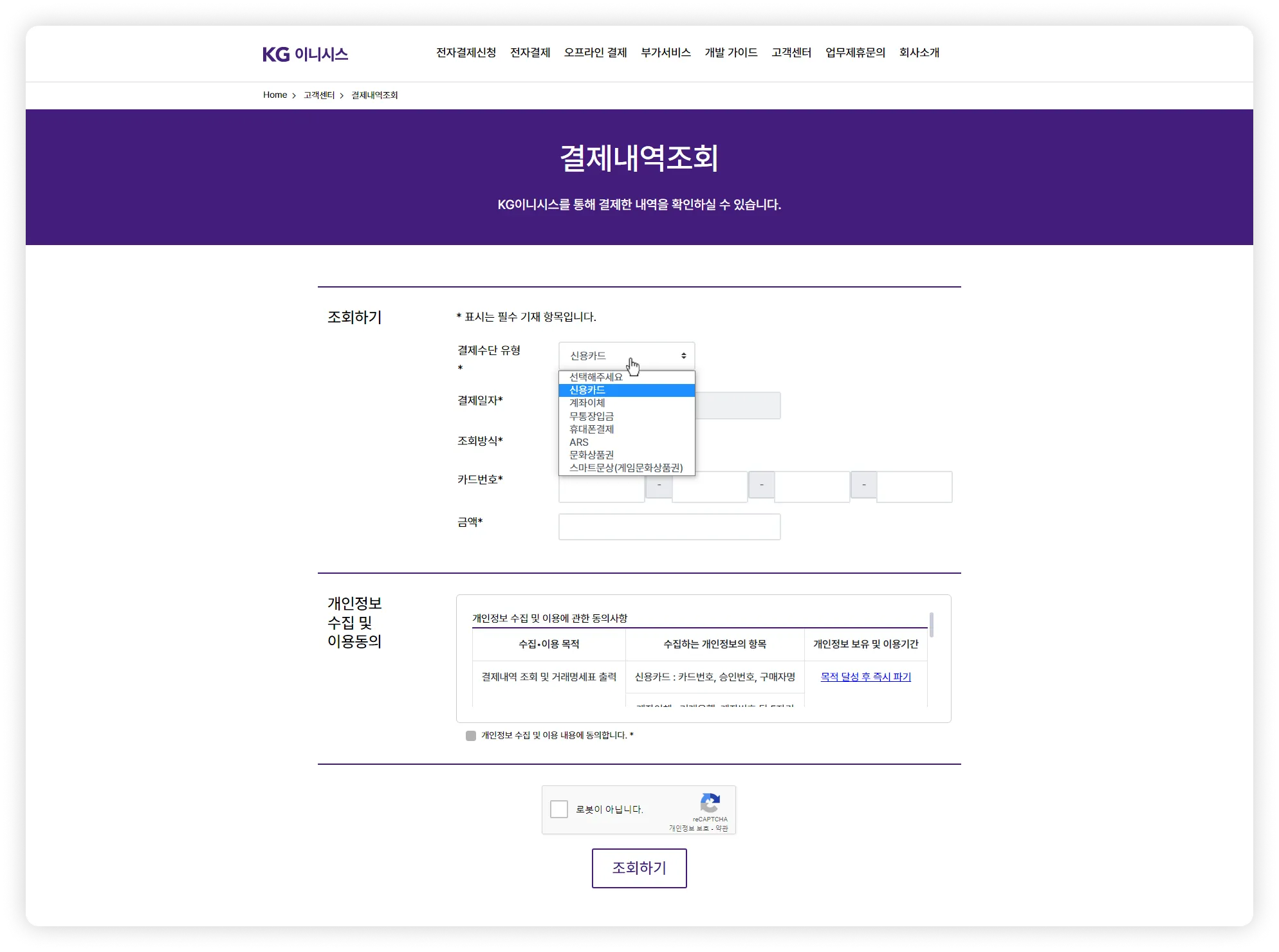 카드번호, 금액 정보 입력, 개인정보 수집 및 이용동의 체크 후 조회하기를 클릭해 주세요.