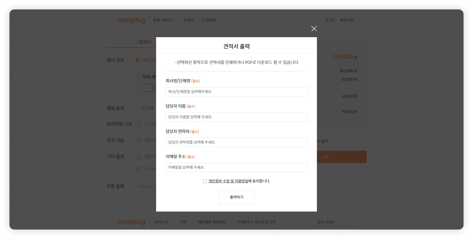 담당자 정보 입력 후 출력하기 버튼 클릭 시 선택한 서비스의 견적을 확인할 수 있습니다.