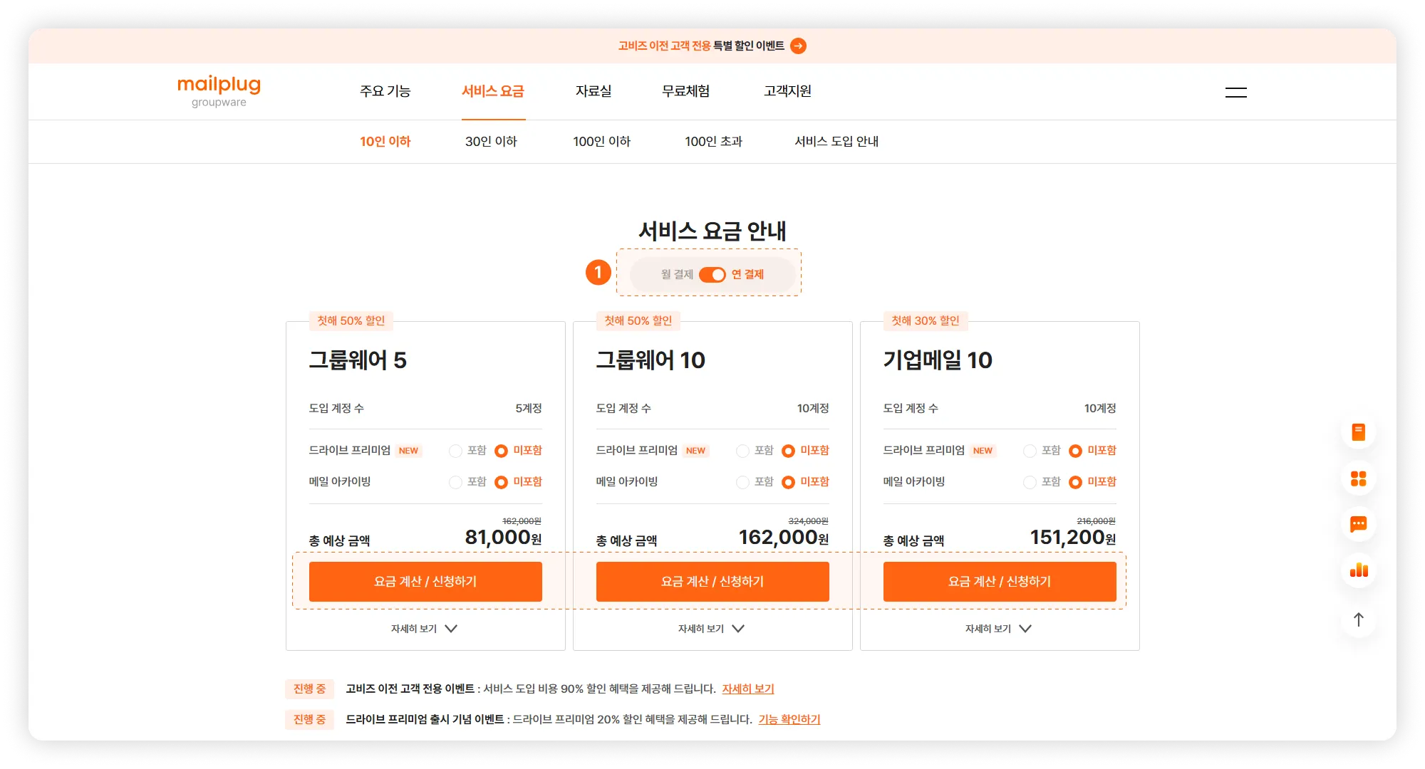 그룹웨어 연 결제 시 첫 해 50%, 기업메일 연 결제 시 첫 해 30% 할인을 받을 수 있습니다.