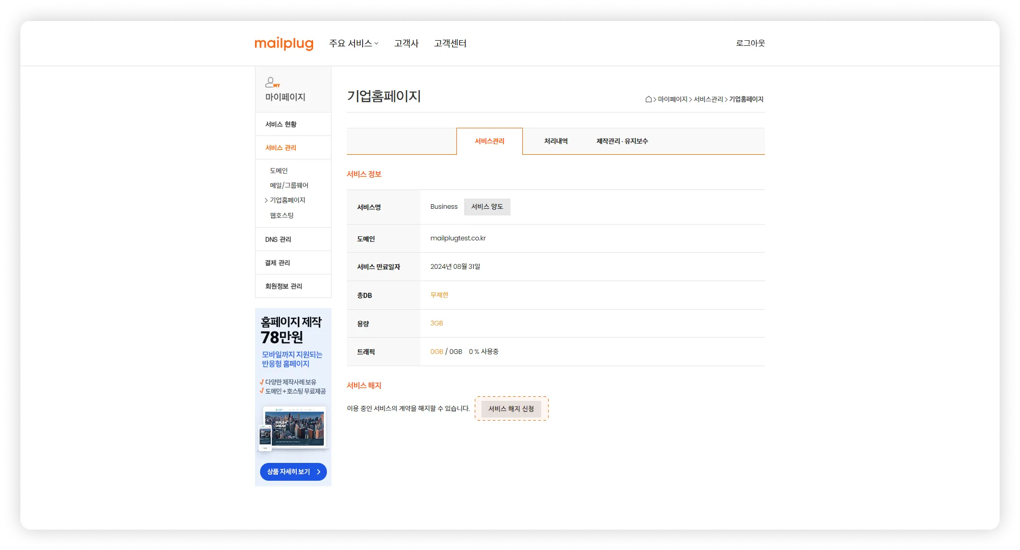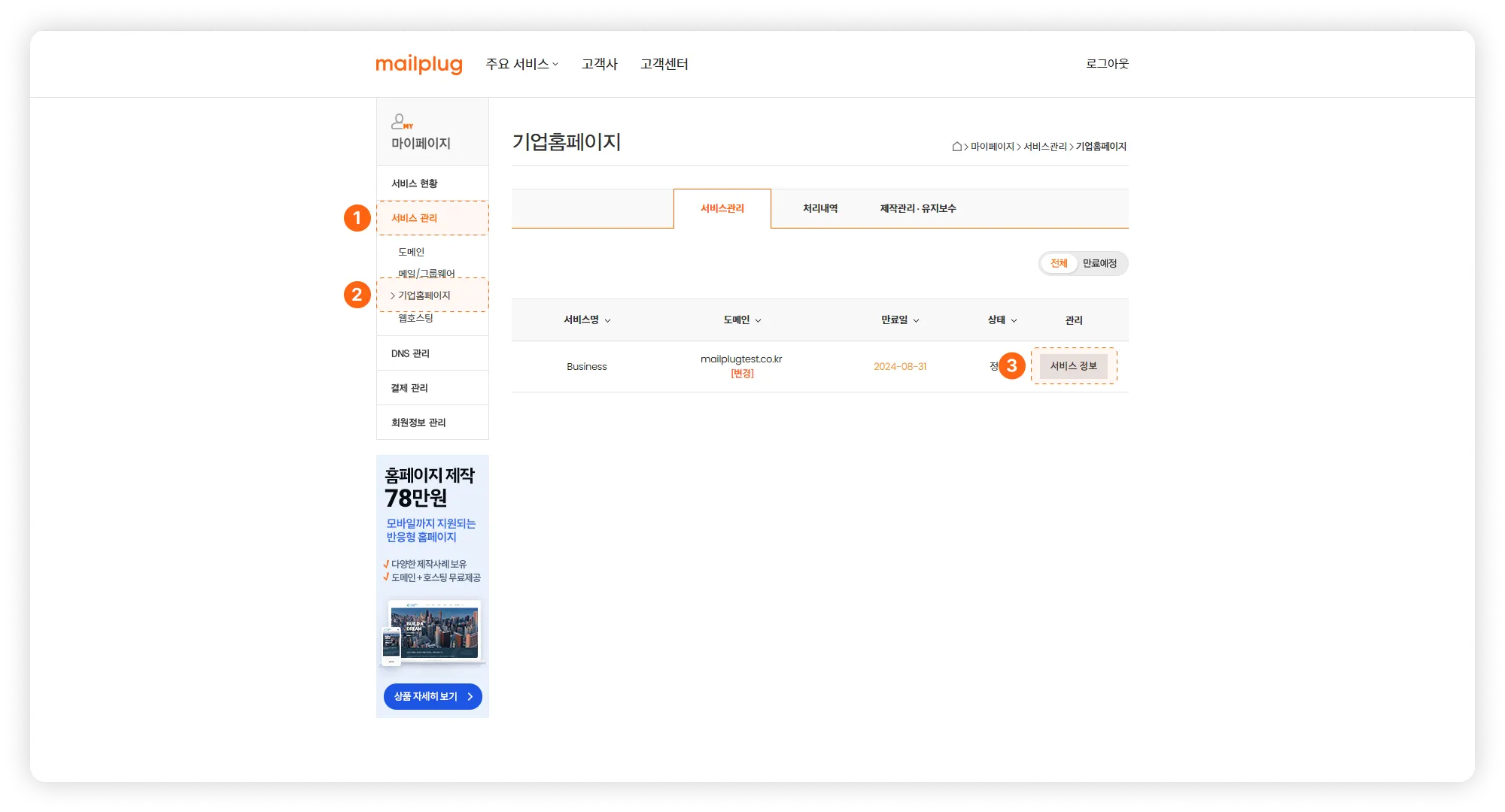 서비스 관리 아래 기업홈페이지를 클릭해 주세요.