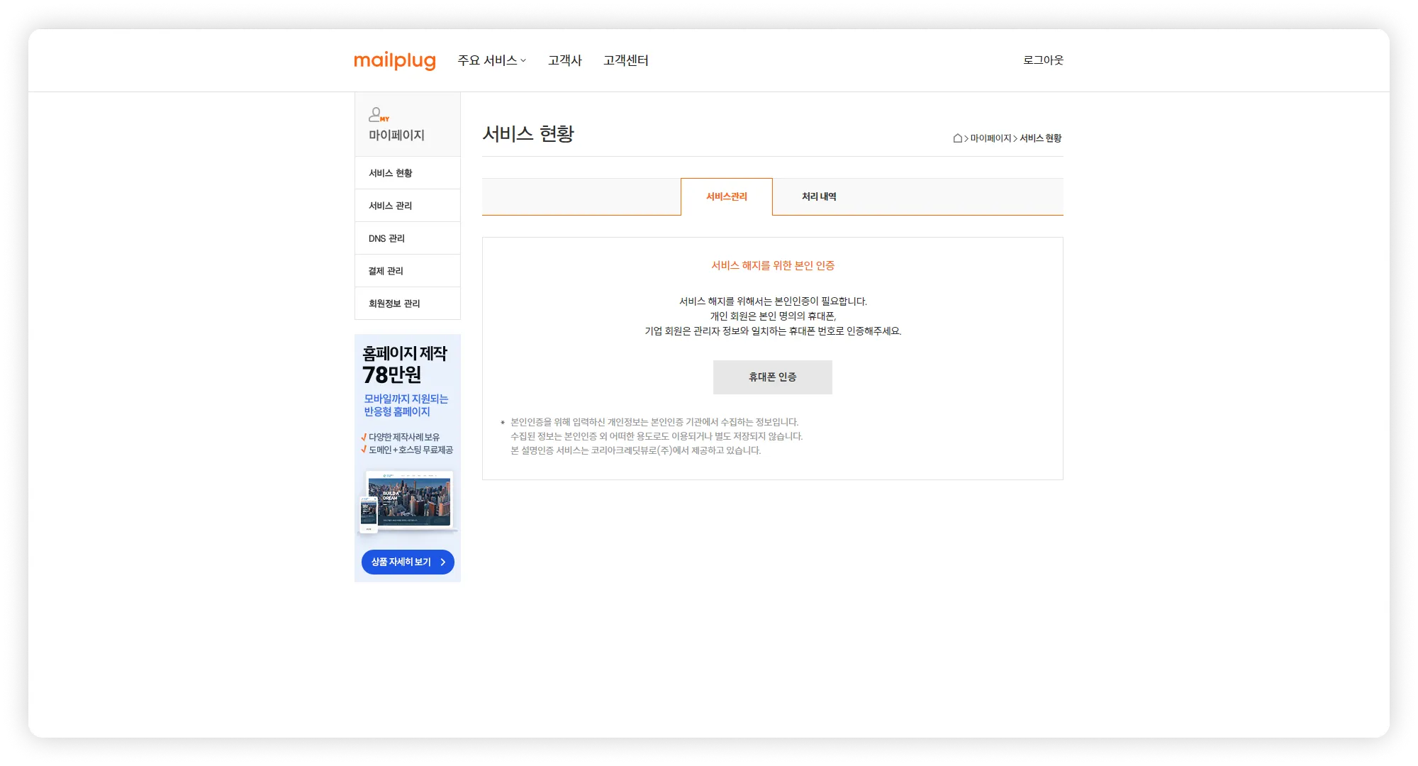 서비스 해지를 위한 본인 인증을 완료합니다.