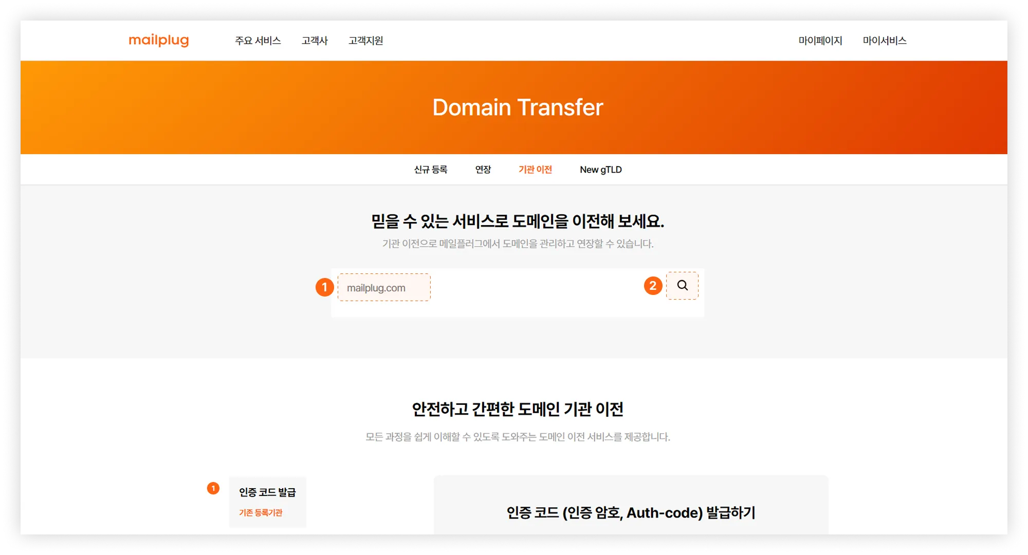 기관 이전을 위한 도메인 인증코드(auth code) 가 필요합니다.