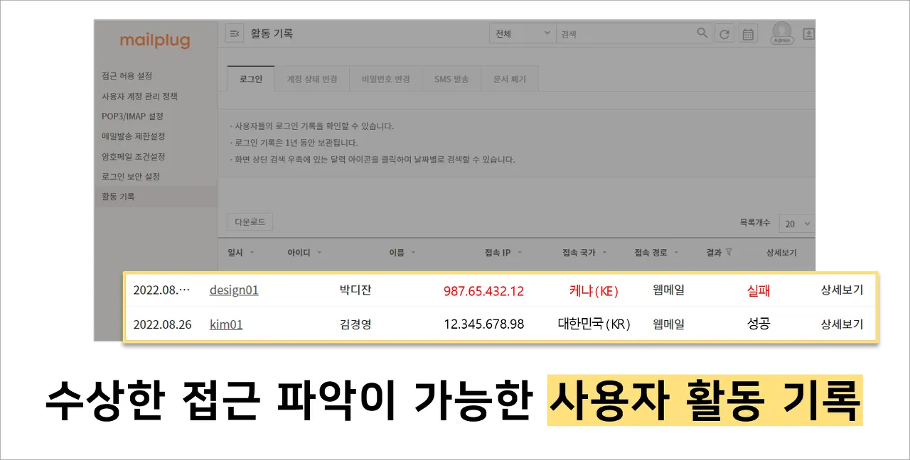 로그인, 비밀번호 변경 시도 등의 사용자의 활동 기록을 확인하실 수 있는데요.