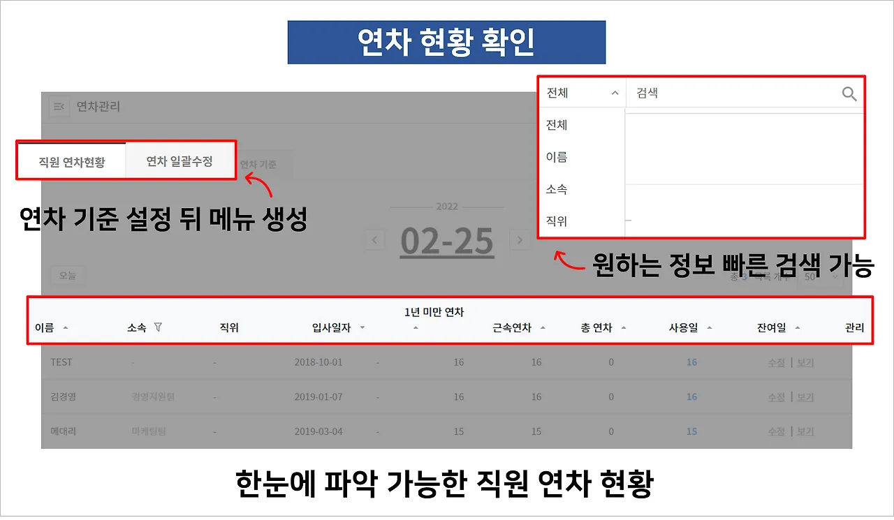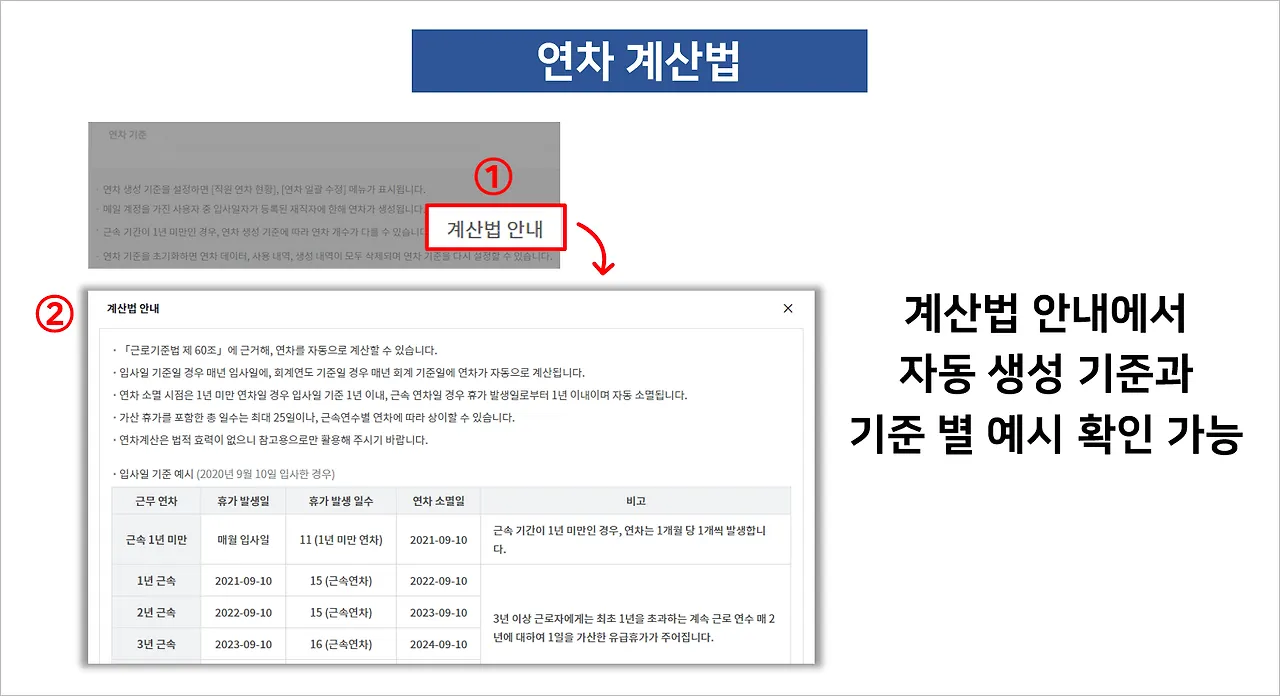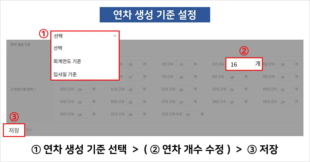 기준 설정은 연차 관리 메뉴에서 진행 가능한데요.