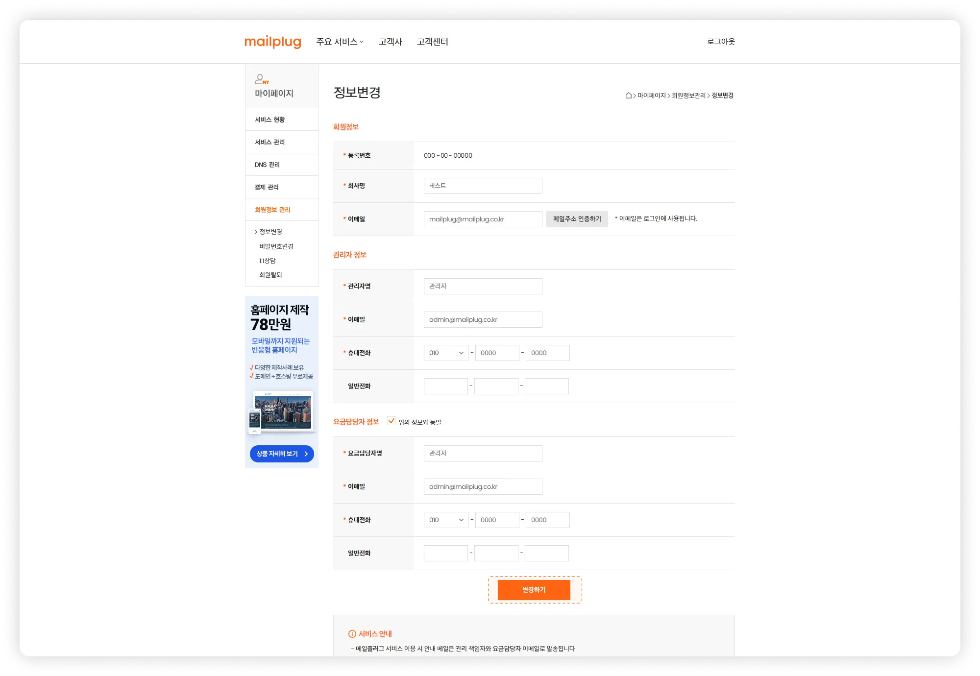 메일플러그의 회원정보는 메일플러그 홈페이지 로그인 후 수정이 가능합니다.
