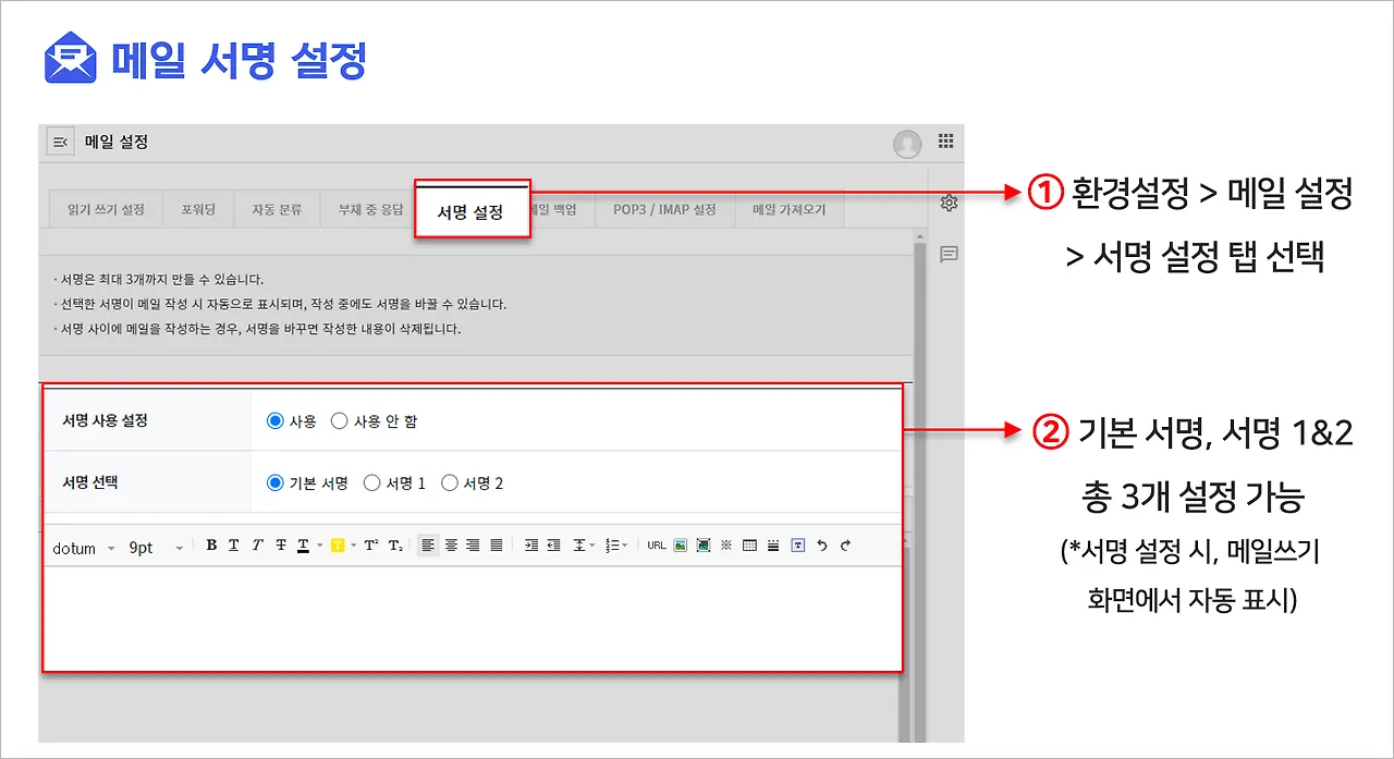 환경설정 > 메일 설정 > 서명 설정에서 총 3개의 서명을 추가할 수 있는데요.