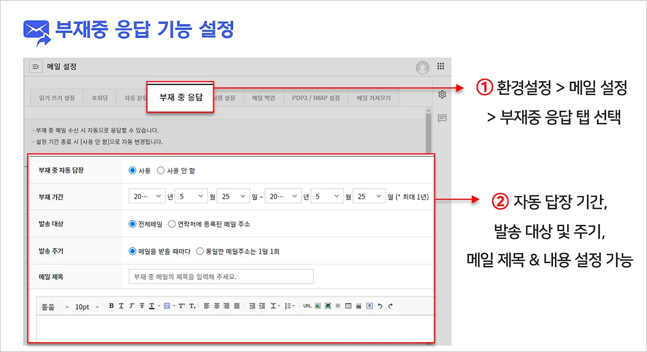 환경설정 > 메일 설정 > 부재중 응답 탭에서 설정할 수 있는데요.