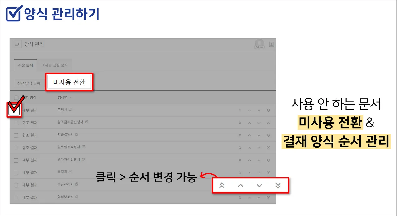 사용 여부 / 결재 방식 / 양식명이 표기되어 문서 내용을 빠르게 파악할 수 있는데요.
