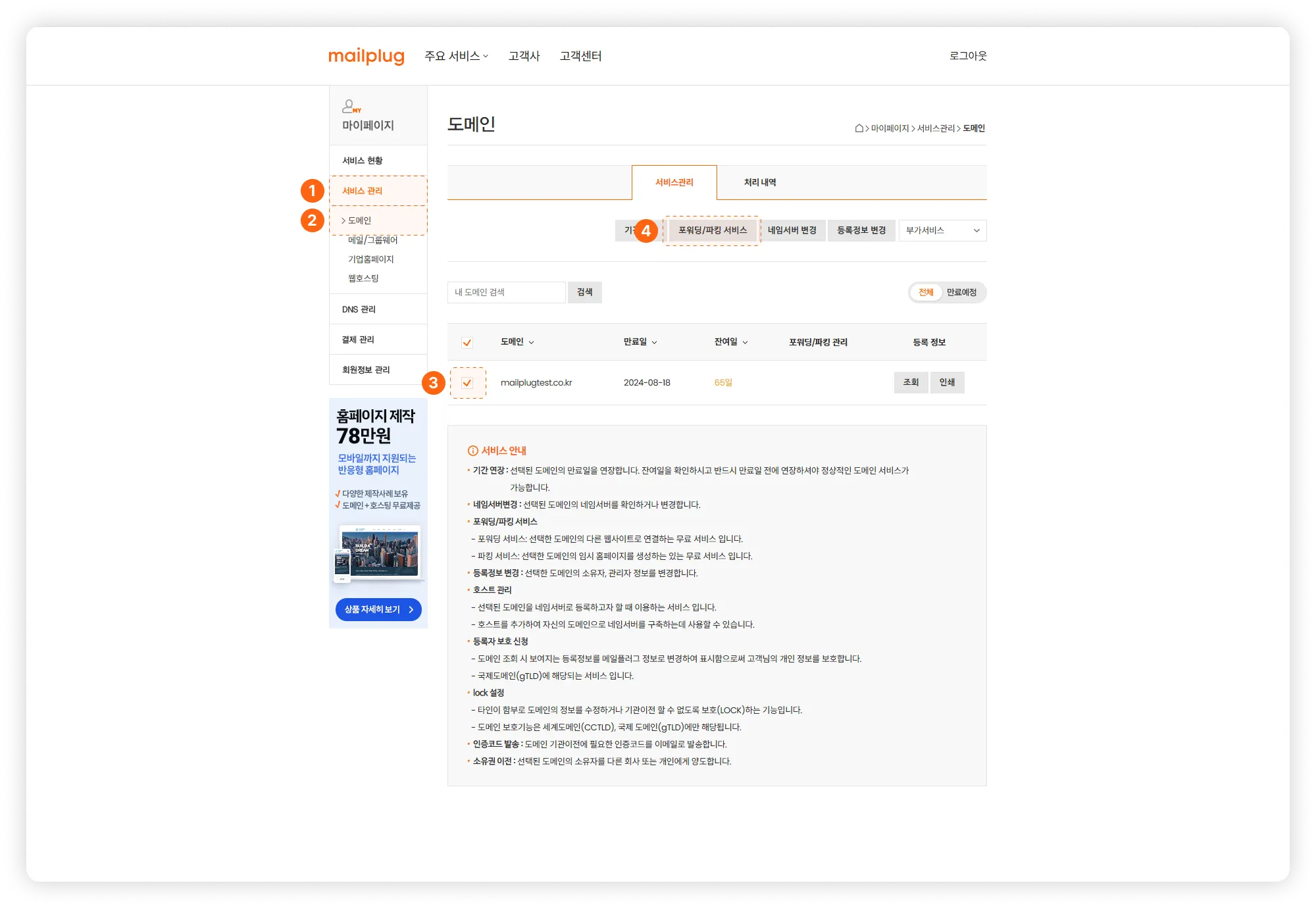 서비스 관리 아래 도메인을 클릭해 주세요.