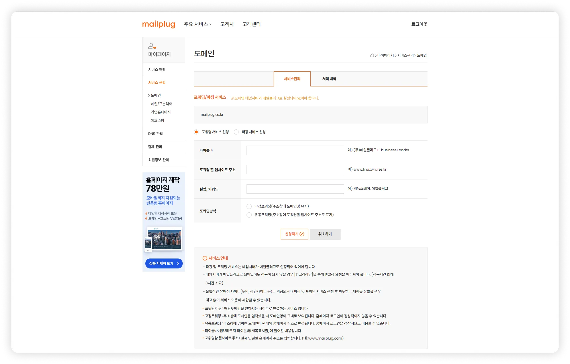 타이틀바, 포워딩 할 웹사이트 주소, 설명/키워드, 포워딩 방식을 입력하고 신청하기를 클릭해 주세요.