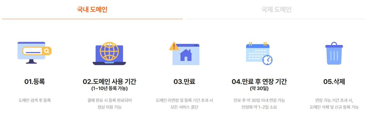 국제 도메인 : 연장 가능 기간 > 복구 가능 기간 > 삭제 대기 > 도메인 삭제