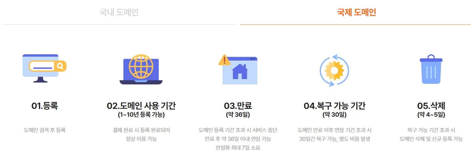단, 국제 도메인은 삭제 대기 기간 이전에 복구 가능 기간이 있으며 복구 시 별도의 복구 비용이 추가됩니다.
